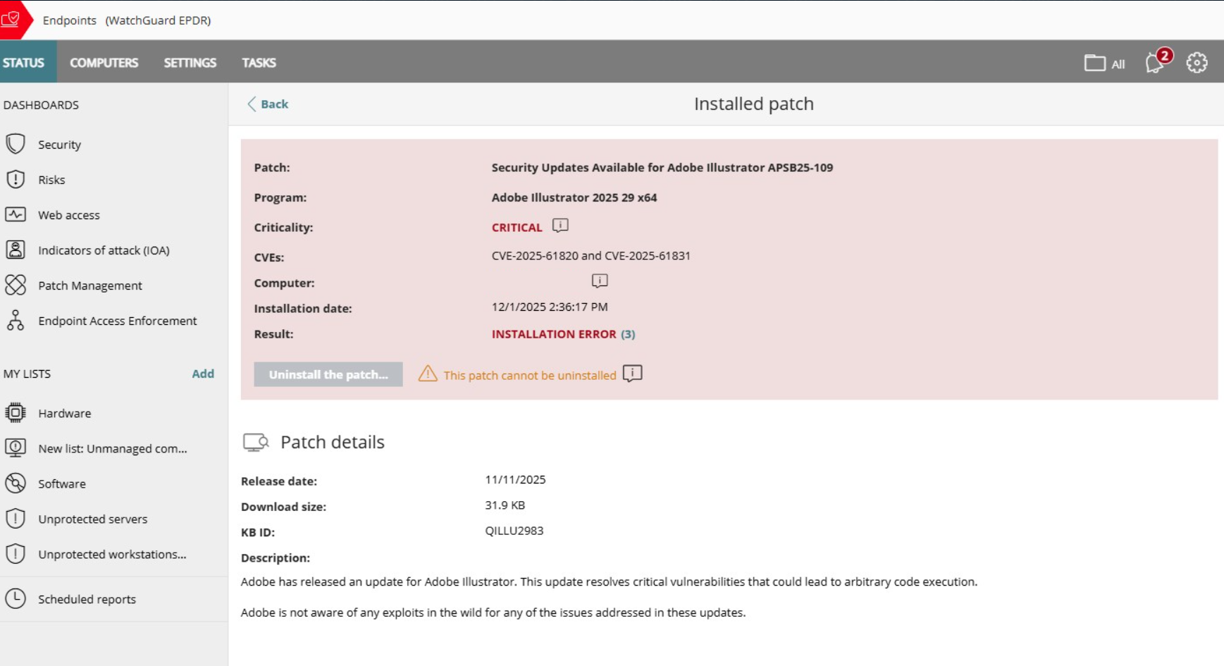 Al parchear software de Adobe con Patch Management, recibes: ERROR DE INSTALACIÓN 3